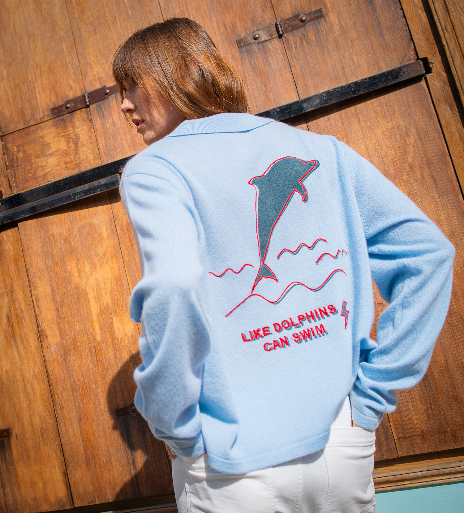 Le pull LIKE DOLPHINS de MADLUV à col polo dont le texte au dos associe impression numérique et broderie pour un rendu en relief qui donne toute sa profondeur au motif.